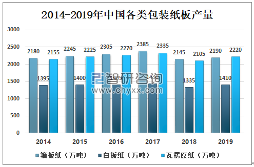 數(shù)據(jù)來源:智研咨詢整理 2、產(chǎn)量 瓦楞原紙又叫瓦楞芯紙。瓦楞原紙經(jīng)過瓦楞機(jī)加工后形成瓦楞。瓦楞紙板可制作紙盒、紙箱、也可用作襯墊。箱板紙,專門供與瓦楞芯紙裱合制成瓦楞紙箱的紙板,其中使用100%未溧硫酸鹽長纖維木漿制成的,叫做牛皮箱板紙,它的強(qiáng)度比一般箱板紙更高。 2019年中國包裝紙板產(chǎn)量為5800萬噸左右,其中箱紙板產(chǎn)量為2190萬噸,白紙板產(chǎn)量為1410萬噸,瓦楞紙產(chǎn)量為2220萬噸。 2014-2019年中國各類包裝紙板產(chǎn)量