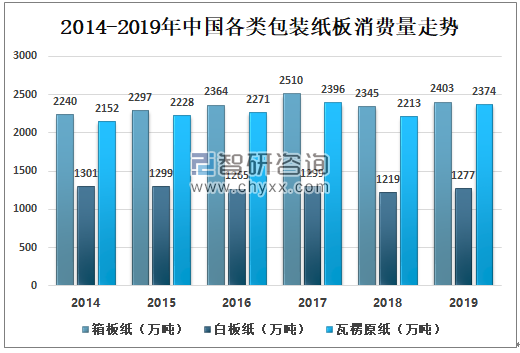 數(shù)據(jù)來源:中國造紙協(xié)會、智研咨詢整理 3、消費(fèi)量 2019年中國箱板紙消費(fèi)量為2403萬噸,比去年增加58萬噸;2019年白板紙消費(fèi)量為1277萬噸,比全年增加58萬噸;2019年瓦楞原紙消費(fèi)量為2374萬噸,比去年增加161萬噸。 2014-2019年中國各類包裝紙板消費(fèi)量走勢