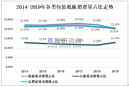 數(shù)據(jù)來源:中國造紙協(xié)會、智研咨詢整理 2019年箱紙板消費(fèi)量占比為20.34%;白紙板消費(fèi)量占比為13.1%;瓦楞原紙消費(fèi)量占比為20.62%。 2014-2019年各類包裝紙板消費(fèi)量占比走勢