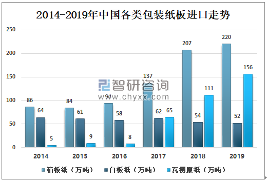 數(shù)據(jù)來源:中國造紙協(xié)會、智研咨詢整理 4、進(jìn)口情況 由于受到環(huán)保持續(xù)趨嚴(yán)、原料供給受限等因素影響,箱紙板和瓦楞原紙進(jìn)口量大幅增長,使國內(nèi)箱紙板和瓦楞原紙市場競爭更加激烈。隨著我國包裝紙板企業(yè)海外項(xiàng)目建成投產(chǎn),進(jìn)口包裝紙板的總量將繼續(xù)增長。2019年箱板紙進(jìn)口數(shù)量為220萬噸;白板紙進(jìn)口數(shù)量為52萬噸,瓦楞原紙進(jìn)口數(shù)量為156萬噸。 2014-2019年中國各類包裝紙板進(jìn)口走勢