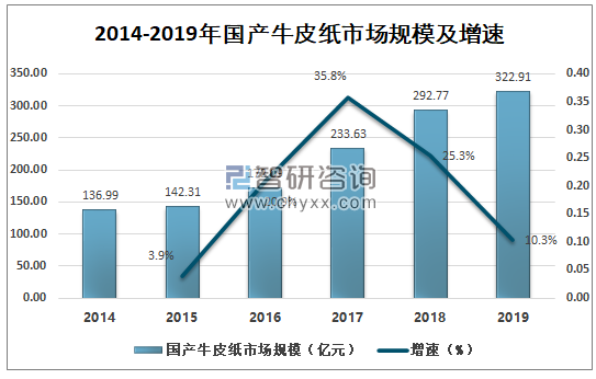 數(shù)據(jù)來源:智研咨詢整理 牛皮紙為環(huán)保包裝紙,是因為牛皮紙可以回收再利用,部分牛皮紙是采用廢紙漿制造屬于再生環(huán)保牛皮紙。2019年中國牛皮紙市場規(guī)模約為322.91億元,同比增加10.3%。 2014-2019年中國牛皮紙市場規(guī)模及增速