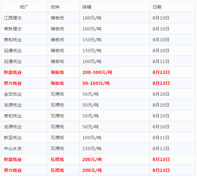 因此,在進(jìn)入本周以后部分小紙廠開始“搶跑”,搶先開啟了降價(jià)模式。截至8月12日,已有山東貴和、遠(yuǎn)通紙業(yè)、中山永發(fā)、東莞金洲等7家紙廠完成了第一步調(diào)價(jià)。