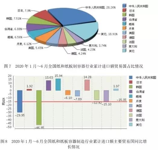 6、進(jìn)口情況 2020年1~6月,全國紙和紙板容器行業(yè)完成累計進(jìn)口額6,133.36萬美元,同比增長-15. 35%。進(jìn)口額排在前五位的國家和地區(qū)依次是中國、日本、韓國、臺灣省、越南(見圖7、圖8)。