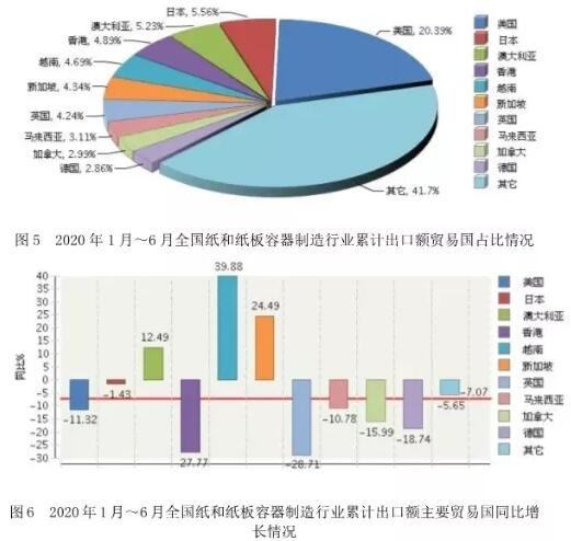 5、出口情況 2020年1~6月,全國紙和紙板容器制造行業(yè)完成累計出口額25. 80億美元,同比增長-7. 07%。出口額排在前五位的國家依次是美國、日本、澳大利亞、香港、越南(見圖5、圖6)。