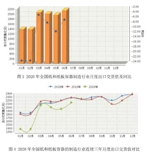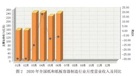 2、紙和紙板容器制造行業(yè)營業(yè)收入情況 2020年1~6月,全國紙和紙板容器制造行業(yè)累計完成主營業(yè)務(wù)收入1265.64億元,同比增長-9.45%。其中: ○ 1月份完成主營業(yè)務(wù)收入155.48億元,同比增長-27.09%; ○ 2月份完成主營業(yè)務(wù)收入155.48億元,同比增長-27.09%; ○ 3月份完成主營業(yè)務(wù)收入243.59億元,同比增長-12.68%; ○ 4月份完成主營業(yè)務(wù)收入244.14億元,同比增長20.44%; ○ 5月份完成主營業(yè)務(wù)收入226.32億元,同比增長-5.68%; ○ 6月份完成主營業(yè)務(wù)收入240. 63億元,同比增長-3.59%(見圖2)。