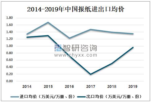 資料來源:中國統計年鑒、智研咨詢整理 2014-2019年中國報紙進出口均價呈波動發展,2018年中國報紙進口均價1.4萬美元/萬冊、份,出口均價0.51萬美元/萬冊、份;2019年中國報紙進口均價1.36萬美元/萬冊、份,出口均價0.96萬美元/萬冊、份。 2014-2019年中國報紙進出口均價