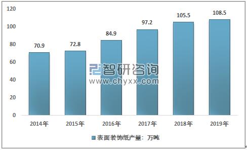 資料來源:智研咨詢整理 我國表面裝飾紙行業的發展整體晚于歐美國家。21世紀以前國內表面裝飾紙主要由歐美國家進口, 21 世紀以來在下游需求市場的促進下,國內部分生產商通過引進國外先進生產技術和管理經驗,行業產品品質及產能均得到有效提升,我國從表面裝飾紙進口國向出口國轉變。 智研咨詢發布的《2021-2027年中國表面裝飾紙行業競爭格局分析及發展趨勢預測報告》顯示:2014年我國表面裝飾紙行業產量70.9萬噸,到2019年增長到了108.5萬噸。近幾年我國表面裝飾紙市場產量情況如下圖所示: 2014-2019年中國表面裝飾紙市場供給情況