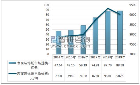 資料來源:智研咨詢整理 目前我國的表面裝飾紙產業在全球市場上已經具有較強的競爭力,產品廣泛出口,國內市場需求也總體穩定增長。同時在環保因素以及國內經濟增長作用下,行業產品價格出現了高速增長,行業市場規模持續擴大,2018年達到了87.70億元,2019年行業產品價格略有回落,需求穩定增長,國內表面裝飾紙行業市場規模達到了88.38億元,小幅增長。 2014-2019年中國表面裝飾紙產業市場規模及其價格走勢