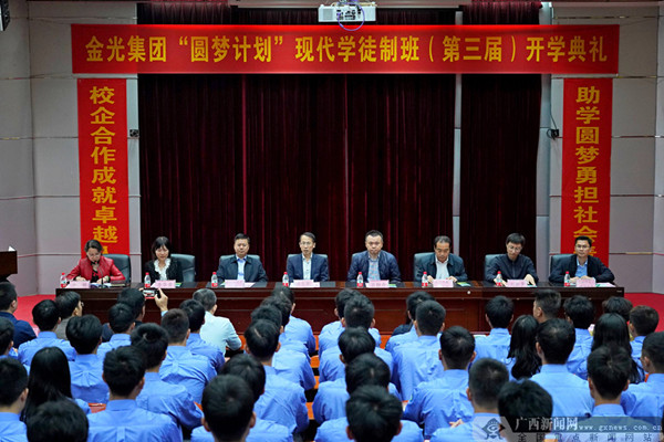 近日,金光集團(tuán)“圓夢(mèng)計(jì)劃”現(xiàn)代學(xué)徒制班開(kāi)學(xué)典禮在廣西工業(yè)職業(yè)技術(shù)學(xué)院多功能廳舉行。現(xiàn)場(chǎng)20級(jí)學(xué)生代表還按照傳統(tǒng)拜師禮儀進(jìn)行拜師禮,向金光集團(tuán)技師敬拜師茶、行拜師禮。