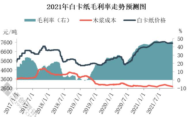 圖2 2021年白卡紙毛利率走勢預(yù)測圖 如圖所示,2017-2018年白卡紙價格呈現(xiàn)震蕩上漲的態(tài)勢, 2018年二季度開始下降,2019年一季度個別月份紙廠漿價小幅上行,而紙價下行,紙廠虧損。2019年下半年開始,漿價連續(xù)下行,白卡紙市場格局良好,紙價開啟上行通道,企業(yè)利潤有所增加。 2020年下半年開始白卡紙迎來行業(yè)景氣周期,另外產(chǎn)能集中度進一步提升,紙廠話語權(quán)加重,紙價連續(xù)拉漲,紙廠利潤大幅增加。 卓創(chuàng)預(yù)計2021年白卡紙價格持續(xù)上行,而2021年全球經(jīng)濟回暖背景下針葉漿未來三年沒有新產(chǎn)能投放,價格處于上行通道,但受闊葉漿影響預(yù)計不會有很大漲幅;闊葉漿目前供過于求,明年有部分新產(chǎn)能,價格大漲可能非常小。 卓創(chuàng)認為白卡紙規(guī)模紙廠多屬于漿紙一體化,消耗量占比最多的化機漿以紙廠自產(chǎn)為主,預(yù)計2021年三季度之前尚無新增產(chǎn)能,同時受漿價對紙價影響偏弱影響,紙廠利潤繼續(xù)增加。 觀點: 從原料方面來說,卓創(chuàng)認為白板紙與原料相關(guān)性增加,但不是唯一,除了受供應(yīng)端收緊影響,廢紙偏強震蕩以及原料替代品帶來的成本端增加,另外還將受白卡紙規(guī)模紙廠連續(xù)推漲帶動帶來的提漲刺激; 白卡紙或?qū)⑴c原料一致性再次減弱,主因市場供應(yīng)僅在3季度以后有所增加,而需求受經(jīng)濟恢復(fù)、出口增加、政策推動較強,此外產(chǎn)能集中度較高的行業(yè)格局同樣成為紙價提漲的利好推動。