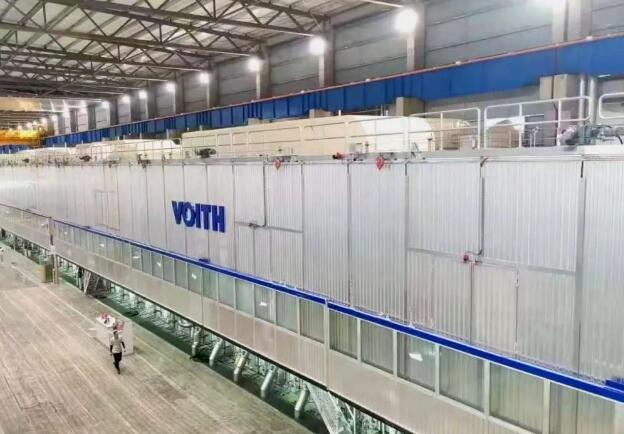 據(jù)悉,該項目紙機由德國VOITH公司提供,主要生產(chǎn)高檔工業(yè)用紙,設計年產(chǎn)能80萬噸,分左右手機布局,其中PM1號為右手機,采用三疊網(wǎng)、雙靴壓、表面施膠、硬壓光飾面技術,設計幅寬6660mm,車速1200m/min,生產(chǎn)定量140-250g/㎡的箱板紙;PM2為左手機,生產(chǎn)100-160g/㎡的低定量牛皮箱板紙。在一個生產(chǎn)車間同時建造兩條不同的生產(chǎn)線,生產(chǎn)不一樣的包裝用紙的左右手紙機項目,其最大好處是投資省、效益高、制漿纖維原料利用率高。兩臺紙機能夠在保持高車速、高效率的前提下,保證產(chǎn)品品質(zhì),生產(chǎn)高檔牛皮箱板紙具有運行效率高、成形好、橫幅定量均一、成紙強度高、質(zhì)量成熟穩(wěn)定等特點,同時具有節(jié)約資源、降低包裝成本、減少碳排放的特性。