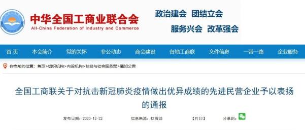為大力弘揚在抗擊新冠肺炎疫情中形成的偉大精神,充分激發(fā)廣大民營經(jīng)濟人士的責任感使命感榮譽感,廣泛凝聚眾志成城、共克時艱的強大正能量,2020年12月14日,中華全國工商業(yè)聯(lián)合會通報表揚了對抗擊新冠肺炎疫情做出優(yōu)異成績的先進民營企業(yè)。