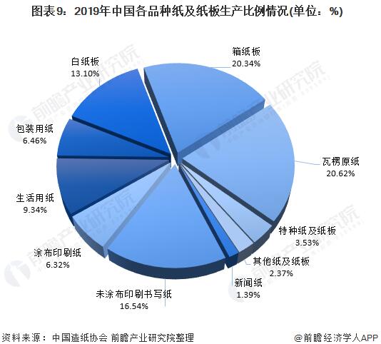 從細分產品產量結構來看,紙及紙板的主要產品中:未涂布印刷書寫紙生產量占紙及紙板總生產量的16.54%,箱紙板生產量占紙及紙板總生產量的20.34%,瓦楞原紙生產量占紙及紙板總生產量的20.62%,新聞紙、特種紙和紙板等的產量占比較小。