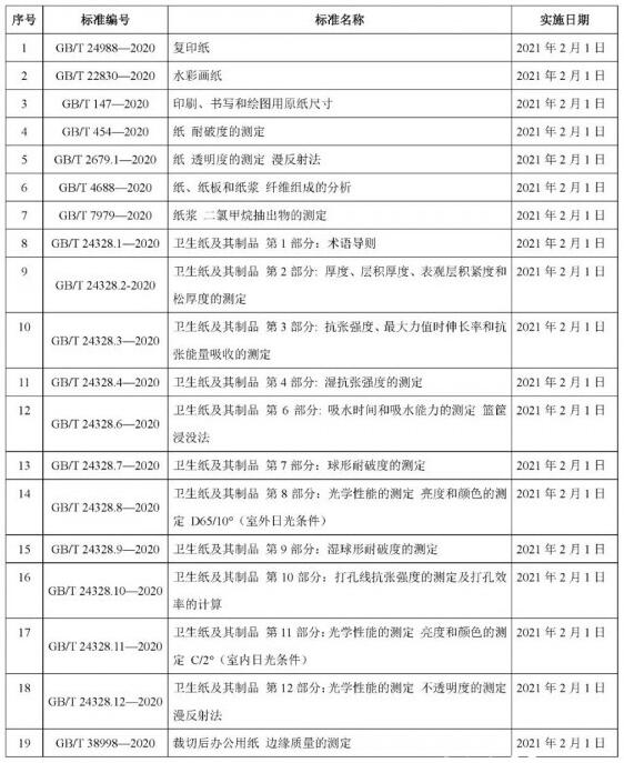 2020年發(fā)布的GB/T 24988—2020《復(fù)印紙》等19項(xiàng)造紙國(guó)家標(biāo)準(zhǔn)已于2021年2月1日實(shí)施,請(qǐng)各相關(guān)單位積極執(zhí)行新標(biāo)準(zhǔn)。