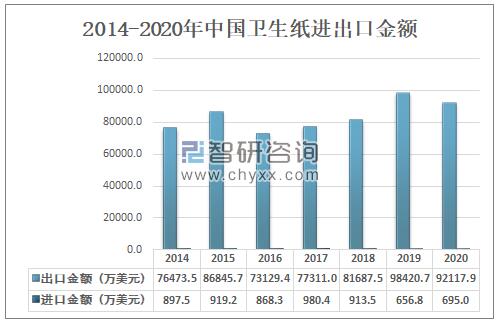 資料來(lái)源:中國(guó)海關(guān)、智研咨詢整理 智研咨詢發(fā)布的《2021-2027年中國(guó)衛(wèi)生紙行業(yè)競(jìng)爭(zhēng)格局分析及發(fā)展趨勢(shì)預(yù)測(cè)報(bào)告》數(shù)據(jù)顯示:2019年中國(guó)衛(wèi)生紙出口金額為98420.7萬(wàn)美元,進(jìn)口金額為656.8萬(wàn)美元;2020年中國(guó)衛(wèi)生紙出口金額為92117.9萬(wàn)美元,進(jìn)口金額為695.0萬(wàn)美元。 2014-2020年中國(guó)衛(wèi)生紙進(jìn)出口金額