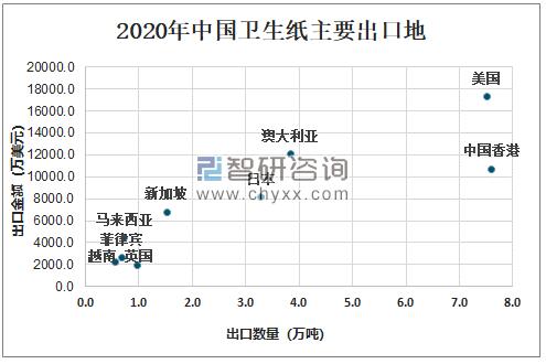 資料來(lái)源:中國(guó)海關(guān)、智研咨詢整理 2020年中國(guó)衛(wèi)生紙出口主要集中在中國(guó)香港、美國(guó)及澳大利亞,出口數(shù)量分別為7.59萬(wàn)噸、7.51萬(wàn)噸、3.83萬(wàn)噸,出口金額分別為 10722.43萬(wàn)美元、17273.28萬(wàn)美元、12043.85萬(wàn)美元。中美貿(mào)易戰(zhàn)以來(lái),中國(guó)出口到美國(guó)的衛(wèi)生紙量明顯下滑。 2020年中國(guó)衛(wèi)生紙主要出口地