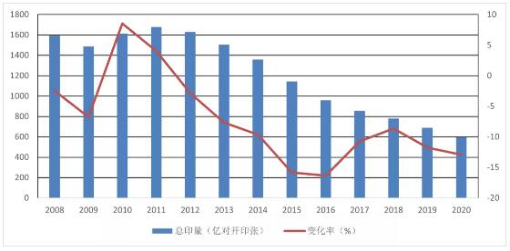圖1 2008-2020年全國報紙印刷總量 從圖1數據來看,全國報紙年度總印刷量在經歷了2008、2009兩年的下降和2010、2011兩年的增長后,近年來又呈現出連續下降的趨勢。2008、2009年金融危機波及報紙印刷行業,印刷總量大幅下滑。隨著經濟復蘇,2010、2011年出現短暫復蘇,但是自2012年開始又出現9連降。而2020年下降達到12.92%,已經連續兩年出現兩位數的下滑。 報告顯示,全國報紙印刷總量從1994年開始有數據統計,從當時的310億對開張增長到最高值2011年時的1678億對開張。其中,從1997年到2004年年均環比增長曾經達到兩位數。 2020年報紙印量的600億對開張是什么水平呢?從往年的統計數據來看,1999年的報紙印量為637億對開張,與2020年的數據較為接近,報紙印量重回21年前的水平。 都市類報紙受沖擊嚴重,多家報紙宣布休刊或停刊 報告指出,2020年初突如其來的新冠疫情,給國民經濟和社會生活都帶來不小的影響,報紙出版發行也受到較大沖擊,特別是對都市類報紙的影響更為明顯,所以2020年與其它年份在報紙印刷總量變化上的可比性相對較低。但依然能顯示出報紙發展的一定規律。 近年來,國內有大量報紙,特別是同質化嚴重而消耗較多資源的都市類報紙,相繼休刊或停刊,其中包括《京華時報》《東方早報》《新聞晚報》《北京晨報》《法制晚報》等在內的多家知名報紙。據《中國傳媒風云(2017—2018)》不完全統計,從2017年1月1日到2019年1月31日的短短兩年內,國內已有69家報紙停刊休刊。 2020年年底和2021年年初,又有多家報紙,如《松原晨訊》《遵義晚報》《銅都晨刊》《都市資訊報》《德陽晚報》《廣元晚報》《皖北晨報》《皖東晨刊》《益陽城市報》等,宣布休刊或停刊。據不完全統計,僅在2021年元旦前,就有近30家紙質媒體宣布休刊或停刊,有些甚至連休刊詞都沒有留下。熬過了新冠疫情,但終究沒有熬過市場大環境的發展。同時,也有更多的報紙由原來的日刊轉為周刊,甚至月刊。 上游報紙出版發行量的減少,直接導致報紙印量的下降。早在多年前,《印刷經理人》雜志在統計“中國印刷包裝企業100強”時,每年都會有多家報紙印刷企業入選,但近幾年來已經難覓蹤影。一些報紙印刷企業,在面臨報紙印量下滑危機時,不斷拓展印刷品類,向商業印刷、包裝印刷進軍,引進數字印刷設備,嘗試多種印刷方式等做法,不斷探索多元化發展,也取得了一定的成績。 2021年,預計對于報紙印刷企業來說,依舊是艱難的一年。從總體趨勢看,雖然疫情對于全國經濟發展的影響逐漸散去,我國經濟活動正逐漸恢復甚至會超過疫情前水平,但由于新興媒體對于傳統媒體的沖擊仍在繼續,以抖音、快手為主要力量的視頻媒體發展快速,占據了公眾相當多的注意力資源,而以今日頭條、微信公眾號為代表的基于算法和社交媒體裂變的新興媒體發展勢頭依然強勁,對于報紙原讀者群的吸收仍在加速。 即使疫情的影響已經完全消除,但轉移的注意力很難再回歸傳統紙質媒體。在多種因素的推動下,2021年全國報紙印量持續下滑仍是大概率事件,但降幅有收窄、甚至有重回個位數的可能。展望未來,我國報紙印刷總量能否止住目前快速下滑的頹勢,進入相對穩定的態勢,仍待進一步觀察,讓我們拭目以待。