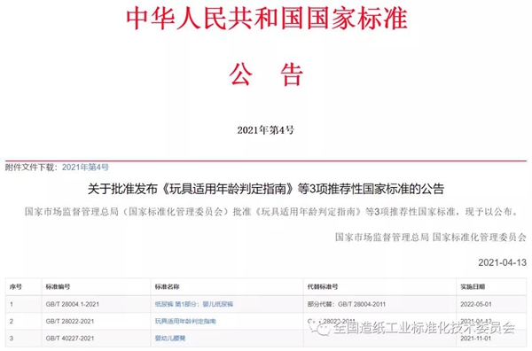 4月13日,國家標(biāo)準(zhǔn)化管理委員會(huì)發(fā)布2021年第4號(hào)國家標(biāo)準(zhǔn)公告,批準(zhǔn)了GB/T 28004.1—2021《紙尿褲 第1部分:嬰兒紙尿褲》。請(qǐng)各相關(guān)單位積極組織實(shí)施。