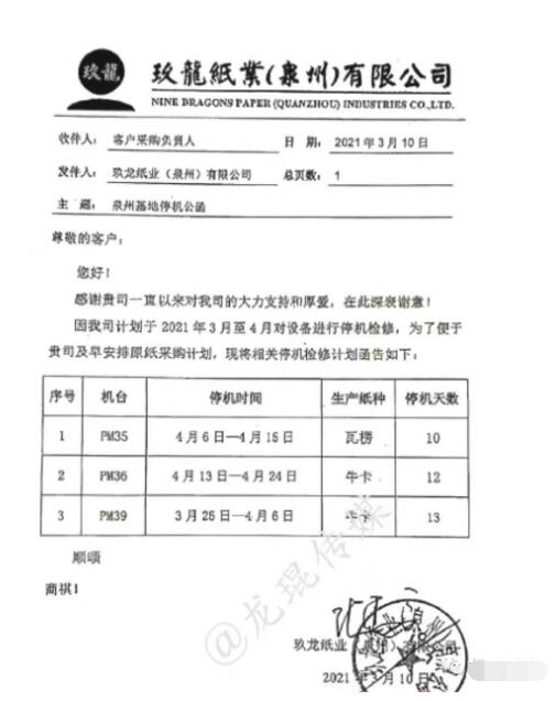 需求乏力,強(qiáng)勢(shì)如玖龍紙業(yè),也不得不向市場(chǎng)屈服。近日,玖龍紙業(yè)又一個(gè)基地公布停機(jī)通知——重慶玖龍4臺(tái)紙機(jī)將在五月份全部停機(jī)12天。與此同時(shí),玖龍紙業(yè)旗下多個(gè)基地原紙降價(jià),降幅為100-400元/噸。 各類原紙價(jià)格下滑 4月20日,多個(gè)渠道傳出,天津玖龍紙業(yè)開(kāi)始下調(diào)原紙價(jià)格。具體而言,再生紙、瓦楞紙、牛卡紙下調(diào)150元/噸,白面牛卡紙、涂布牛卡紙下調(diào)100元/噸,地龍灰底白下調(diào)300元/噸,江龍灰底白下調(diào)400元/噸。 100-400元/噸的降幅,似乎是今年在包裝紙行業(yè)首次見(jiàn)到。這也在一定程度上證明,面對(duì)下游需求乏力的現(xiàn)狀,作為龍頭紙廠的玖龍紙業(yè)也不得不向市場(chǎng)屈服。據(jù)了解,除天津基地外,玖龍紙業(yè)太倉(cāng)、東莞、泉州、重慶、沈陽(yáng)等基地亦在近期實(shí)施了降價(jià)或優(yōu)惠的舉措。 目前市場(chǎng)仍處于淡季,下游包裝企業(yè)基本上以剛需采購(gòu)為主,國(guó)內(nèi)各大地區(qū)、各大紙廠的瓦楞紙、箱板紙等包裝紙出貨節(jié)奏放緩,價(jià)格出現(xiàn)不同程度的下滑。預(yù)計(jì)二季度,紙價(jià)將整體處于穩(wěn)中有跌的走勢(shì),二季度末或出現(xiàn)小幅反彈跡象,三季度或?qū)⒅匦律郎厣险{(diào)。 多個(gè)基地停機(jī)檢修 對(duì)于紙廠而言,應(yīng)對(duì)市場(chǎng)景氣度不高的舉措主要有二,一是通過(guò)降價(jià)以抬高出貨量,二是通過(guò)停機(jī)檢修來(lái)減少供應(yīng)量。以玖龍紙業(yè)為例,據(jù)筆者了解,除了原紙降價(jià)外,其多個(gè)基地的多臺(tái)紙機(jī)正處于停機(jī)檢修狀態(tài)或即將開(kāi)始停機(jī)檢修。 4月17日,玖龍紙業(yè)重慶基地發(fā)布停機(jī)公函稱,因公司檢修安排,計(jì)劃在五月份全面停機(jī)檢修。該紙廠目前共有4條造紙生產(chǎn)線,主要生產(chǎn)牛卡紙、瓦楞紙和涂布灰底白板紙,年產(chǎn)能近200萬(wàn)噸。其中: PM22機(jī)臺(tái):生產(chǎn)白卡紙,5月18日到5月29日停機(jī)12天; PM23機(jī)臺(tái):生產(chǎn)瓦楞紙,5月18日到5月29日停機(jī)12天; PM33機(jī)臺(tái):生產(chǎn)白板紙,5月10日到5月21日停機(jī)12天; PM40機(jī)臺(tái):生產(chǎn)低克重再生及瓦紙,5月10日到5月21日停機(jī)12天。  同時(shí),玖龍紙業(yè)天津基地部分機(jī)臺(tái)正處于停機(jī)檢修狀態(tài)。根據(jù)停機(jī)公函,其PM34于4月26日至30日停機(jī)5天,PM25于4月6日至12日停機(jī)7天,PM26與4月6日至25日停機(jī)20天,PM27于4月20日至25日停機(jī)6天,PM31于4月13日至19日停機(jī)7天。  而玖龍紙業(yè)泉州基地部分機(jī)臺(tái)已在近期完成了停機(jī)檢修計(jì)劃。據(jù)悉,其PM35已于4月6日至4月15日停機(jī)10天,PM36已于4月13日至4月24日停機(jī)12天,PM39已于3月25日至4月6日停機(jī)13天。  可以說(shuō),整個(gè)三四月份以及即將到來(lái)的五月份,玖龍紙業(yè)都將面臨較大的市場(chǎng)壓力。這是紙品包裝產(chǎn)業(yè)鏈的淡旺季周期決定的,即便是產(chǎn)業(yè)鏈話語(yǔ)權(quán)極大的玖龍紙業(yè),也難以改變。