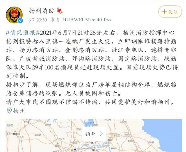 6月8日,揚州消防發布官方通報稱,揚州八里鎮發生火災,經揚州消防指揮中心緊急救援后,目前現場火勢已得到控制。本次火災的燃燒物為倉庫儲存的紙張。無人員被困和傷亡。 官方通告
