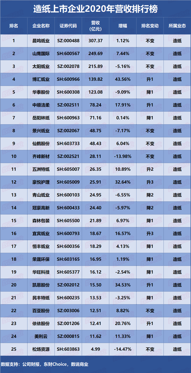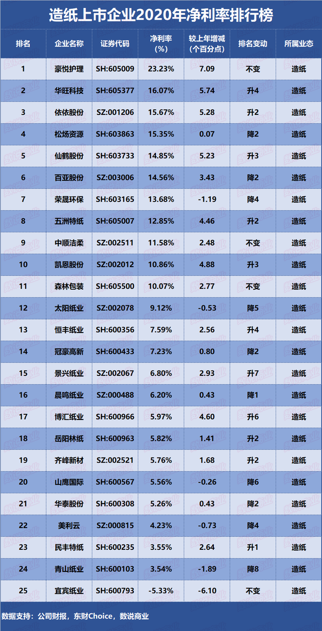▲造紙上市企業2020年營收排行榜 從營收規模來看,晨鳴紙業、山鷹國際、太陽紙業、博匯紙業、華泰股份等5家企業營收位于“百億俱樂部”;中順潔柔和岳陽林紙營收位于50-100億元之間; 景興紙業、仙鶴股份、齊峰新材等在內的17家企業營收位于10-50億元之間;松煬資源營收唯一不足10億元。 從營收增幅來看,有16家企業營收實現正增長,其中博匯紙業、凱恩股份、豪悅護理、依依股份、中順潔柔、宜賓紙業、美利云、五洲特紙等8家企業增幅在兩位數以上,博匯紙業增長最快,營收增幅達到43.56%。 其余9家企業營收均為下滑,其中齊峰新材和松煬資源下滑在兩位數以上,松煬資源下滑最大,營收下滑達到14.47%。 凈利潤 凈利潤是一個企業經營的最終成果,是衡量一個企業經營效益的主要指標。據數說商業統計,造紙上市企業2020年凈利潤總額為116.71億元,較上年同期的96.42億元,增加20.29億元,同比增長21.04%。平均凈利潤由上年同期的3.86億元降低至4.67億元。