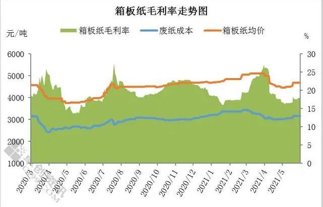 工業包裝紙主要分為箱板紙和瓦楞紙兩類。卓創資訊數據顯示,進入5月份,箱板紙價格環比變動不大,而原料廢紙成本環比上漲2.42%,故5月份箱板紙毛利環比下滑2.89個百分點,紙廠盈利壓力較大。與此同時,瓦楞紙價格漲幅也小于成本面漲幅,毛利呈現下滑態勢。
