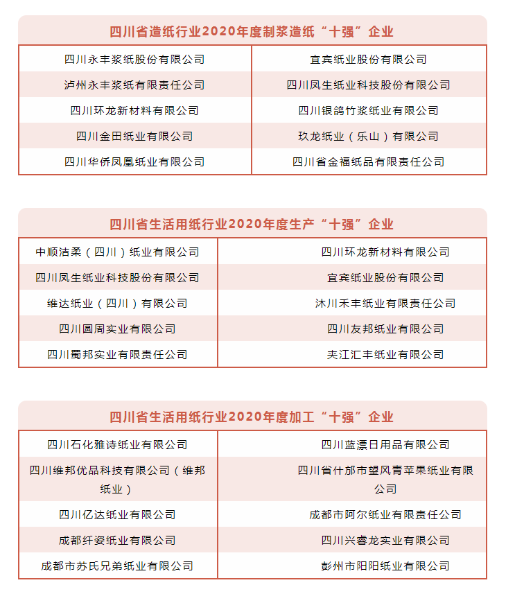 會議中,由四川省造紙學(xué)會理事長范謀斌宣讀了《關(guān)于表彰四川省造紙行業(yè)2020年度“十強(qiáng)”企業(yè)的決定》并為獲獎企業(yè)頒發(fā)證書和獎牌。(名單如下,排名不分先后)