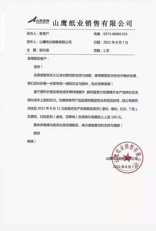 新的一周即將來臨,原紙、紙板漲價潮愈演愈烈。8月7日,山鷹紙業宣布,自8月11日起,公司生產的箱板紙系列(紫衫、銀杉、紅杉、T紙),瓦楞紙,白紙系列(金桂、四季桂)在原有價格基礎上上漲100元/噸。