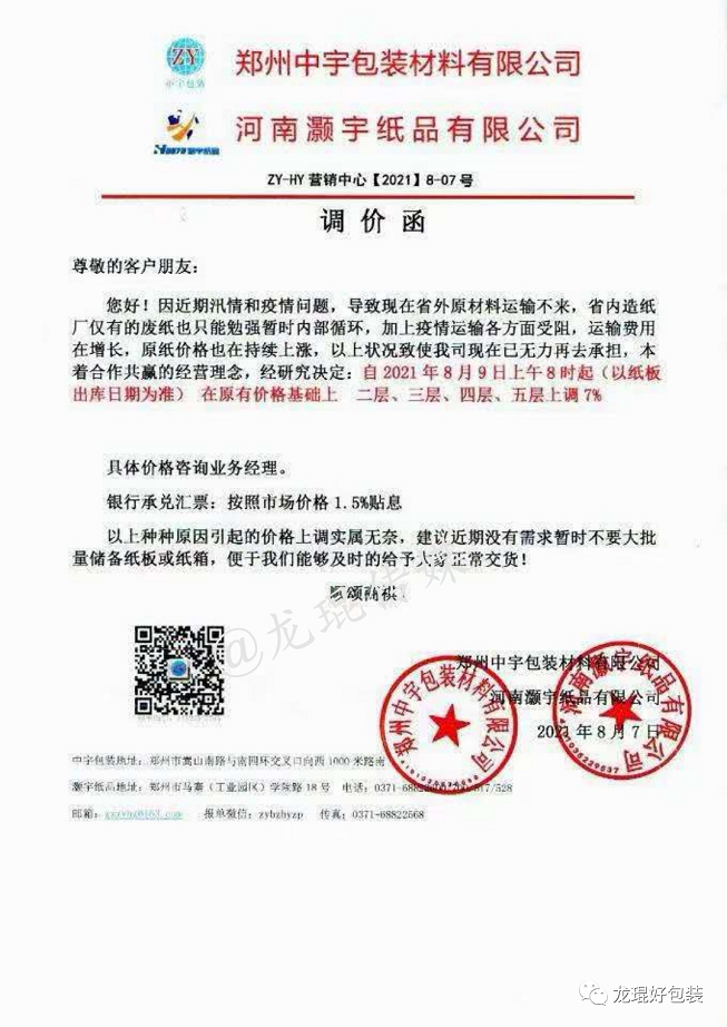 8月7日,河南省領先的紙包裝企業——鄭州中宇包裝材料有限公司/河南灝宇紙品有限公司發布通知稱:因近期汛情及疫情問題,省內造紙廠僅有的廢紙只能勉強內部循環,同時因運輸等各方面受阻,運輸費用增長,原紙價格也在持續上漲,導致公司無力承擔成本。 為此,鄭州中宇包裝材料有限公司/河南灝宇紙品有限公司表示:本著合作共贏的經營理念,經研究決定,從8月9日上午8點起,在原有價格基礎上,二層、三層、四層、五層上調7%。銀行承兌匯票按市場價格1.5%貼息。