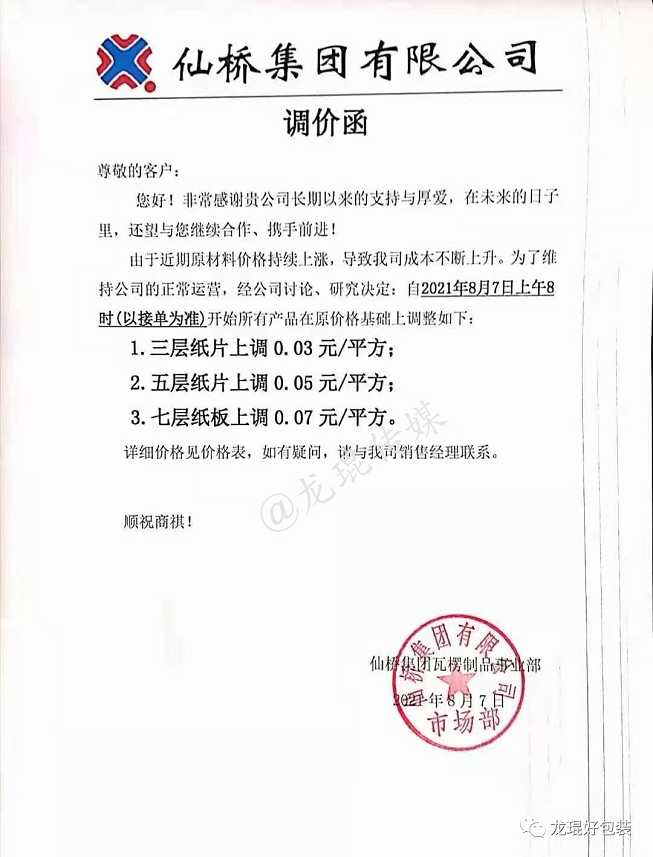 仙橋集團有限公司 從8月7日上午8點開始,三層紙品上調0.03元/平方,五層紙板上調0.05元/平方,七層紙板上調0.07元/平方。