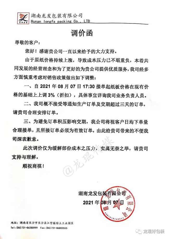 湖南龍發包裝有限公司 從8月7日17點半開始,紙板價格在現有價格基礎上上調3%。