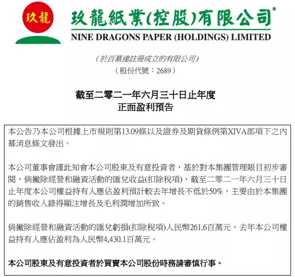 近段時間,紙包裝業的上游廠家陸續發布半年報,字里行間洋溢著豐收的喜悅。受盈利翻番的帶動,上市紙企股價一路走高。正所謂風風順順,雙喜臨門,好不愜意。 具體來看一下: 包裝紙板塊 玖龍:盈利增長不低于50% 8月23日午間,玖龍紙業發布公告稱,基于對集團管理賬目初步審閱,倘撇除經營和融資活動的匯兌收益(扣除稅項),截至2021年6月30日止年度公司權益持有人應占盈利預計較截至2020年6月30日止年度增長不低于50%,主要由于集團的銷售收入錄得顯注增長及毛利潤增加所致。