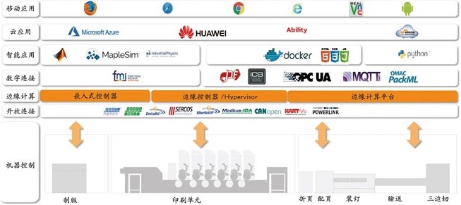 圖2機(jī)器控制系統(tǒng)的數(shù)字化能力 1)機(jī)器的連接能力:由于CPU通常有各種通信模塊,這使得它可以去連接現(xiàn)場(chǎng)的不同設(shè)備,然后將數(shù)據(jù)發(fā)送給控制器,存放在OPCUAServer。這個(gè)SoA架構(gòu),即面向服務(wù)的架構(gòu),允許來自于水平設(shè)備、上位系統(tǒng)的Client-客戶端來訪問,也支持來自手機(jī)類移動(dòng)端的訪問。 2)能源與設(shè)備效率數(shù)據(jù)的采集,包括機(jī)器能耗、班組能耗、實(shí)時(shí)OEE、產(chǎn)線OEE統(tǒng)計(jì),這對(duì)于生產(chǎn)企業(yè)來說評(píng)價(jià)效率至關(guān)重要。 3)預(yù)測(cè)性維護(hù)-基于狀態(tài)監(jiān)測(cè)的維護(hù),可以通過振動(dòng)、溫度信號(hào)的采集并放置控制器,或通過云端數(shù)據(jù)訓(xùn)練并部署在本地,這個(gè)鏈路是可以打通的。 4)遠(yuǎn)程的診斷與維護(hù)能力:SiteManager是一個(gè)本地構(gòu)建“安全”遠(yuǎn)程維護(hù)的技術(shù),它可以通過安全的VPN來提供數(shù)據(jù)的傳輸,并通過無所不在的網(wǎng)絡(luò)、遠(yuǎn)程桌面技術(shù)來實(shí)現(xiàn)遠(yuǎn)程的機(jī)器診斷與調(diào)試。這對(duì)于OEM、工廠的維護(hù)工程師來說都是非常方便的。 像貝加萊這樣的自動(dòng)化廠商,其控制器已經(jīng)突破了傳統(tǒng)PLC僅邏輯控制的能力,其mapp功能中的Tweet可以由機(jī)器發(fā)送警報(bào)、事件的短信或郵件給運(yùn)行系統(tǒng)或操作人員,mappEnergy可以統(tǒng)計(jì)能源、mappOEE可以統(tǒng)計(jì)實(shí)時(shí)機(jī)器運(yùn)行效率、mappDATA可以訪問數(shù)據(jù)庫、mappAudit可以實(shí)現(xiàn)審計(jì)追蹤,從而對(duì)質(zhì)量相關(guān)數(shù)據(jù)進(jìn)行追溯性記錄。 圖3所示則是一個(gè)典型的基于控制技術(shù)平臺(tái)的邊緣智能系統(tǒng)架構(gòu),貝加萊采用Hypervisor技術(shù)的工業(yè)PC能夠?yàn)橛∷⒐S提供邊緣智能實(shí)現(xiàn)。在數(shù)字化應(yīng)用中,包括預(yù)測(cè)性維護(hù)、參數(shù)尋優(yōu)、調(diào)度等問題,可以通過OPCUA的數(shù)據(jù)采集,并建立OPCUA/MQTT的云端數(shù)據(jù)連接,進(jìn)行云端訓(xùn)練,模型可以通過下發(fā)部署在本地的PC,本地的推理可以由PC端的處理器基于Windows或Linux來實(shí)現(xiàn),而RTOS則保證其實(shí)時(shí)的同步與邏輯任務(wù)。  圖3邊緣智能系統(tǒng)架構(gòu) 圖4則是通過控制系統(tǒng)廠商如貝加萊提供的能力構(gòu)建的印刷工廠數(shù)字化能力。其包括幾個(gè)方面: