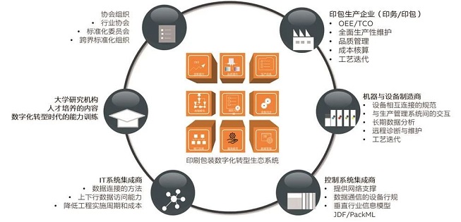 圖4整體的數(shù)字化架構(gòu) 1)對(duì)于機(jī)器的設(shè)計(jì)而言,MATLAB/Simulink的建模仿真可以與貝加萊的控制系統(tǒng)設(shè)計(jì)平臺(tái)AutomationStudio之間進(jìn)行連接,這樣數(shù)字化設(shè)計(jì)可以連接到控制,協(xié)同仿真。第二種情況目前尚未被驗(yàn)證,即數(shù)字化的JDF文件可以被XML格式讀取,并解析,這個(gè)現(xiàn)階段可以采用控制器的讀取任務(wù)來實(shí)現(xiàn),可以通過程序解析作業(yè)單,并下發(fā)到機(jī)器上,自動(dòng)與配方系統(tǒng)結(jié)合,從而實(shí)現(xiàn)自動(dòng)運(yùn)行。當(dāng)然,其工作流程需要人員確認(rèn),避免錯(cuò)誤發(fā)生。 2)OPCUA的通信連接:OPCUA不僅能夠提供作業(yè)單任務(wù),它的各種信息模型如視覺與機(jī)器人、AutoID的原材料條碼進(jìn)入、物流倉儲(chǔ)信息集成,包括控制器間的交互、與云端的交互均可實(shí)現(xiàn)。 印刷工業(yè)數(shù)字化需要協(xié)作 為了實(shí)現(xiàn)數(shù)字化轉(zhuǎn)型,對(duì)于印刷工業(yè)來說需要各方進(jìn)行協(xié)作,并在協(xié)會(huì)、標(biāo)委會(huì)組織下,共同制定可行的產(chǎn)業(yè)整體規(guī)劃,這是一個(gè)需要通盤推進(jìn)的工作。其產(chǎn)業(yè)生態(tài)構(gòu)建如圖5所示,在此對(duì)各方的工作提出以下建議:  圖5數(shù)字化轉(zhuǎn)型中產(chǎn)業(yè)生態(tài)協(xié)作問題 首先,對(duì)于印包企業(yè),也包括終端用戶,需要清晰自己的數(shù)字化需求。這些不僅為了自身的運(yùn)營管理水平數(shù)字化升級(jí),也包括對(duì)上游的機(jī)械制造商、系統(tǒng)集成商、信息化集成商提出規(guī)約,這樣才會(huì)有共同努力的方向。 其次,在產(chǎn)業(yè)需求的基礎(chǔ)上,由協(xié)會(huì)組織如印刷行業(yè)協(xié)會(huì)、標(biāo)委會(huì)以及跨界的如OPC基金會(huì)、自動(dòng)化行業(yè)的通信規(guī)約、數(shù)字化車間標(biāo)準(zhǔn)化組織來共同開發(fā)針對(duì)印刷工業(yè)的行業(yè)規(guī)約,通過產(chǎn)業(yè)協(xié)同來為產(chǎn)業(yè)制定數(shù)字化發(fā)展的指南、指導(dǎo),從而推進(jìn)產(chǎn)業(yè)整體發(fā)展。 再次,機(jī)器制造商、自動(dòng)化廠商開展協(xié)作,將在其他領(lǐng)域的數(shù)字化經(jīng)驗(yàn)、技術(shù)、方法與印刷行業(yè)的產(chǎn)業(yè)實(shí)際結(jié)合,開發(fā)致力于解決質(zhì)量、成本、效率提升的解決方案。 總而言之,印刷工業(yè)的數(shù)字化并非一蹴而就,也不是單個(gè)方面可以推進(jìn)的,需要產(chǎn)業(yè)的廠商共同努力。