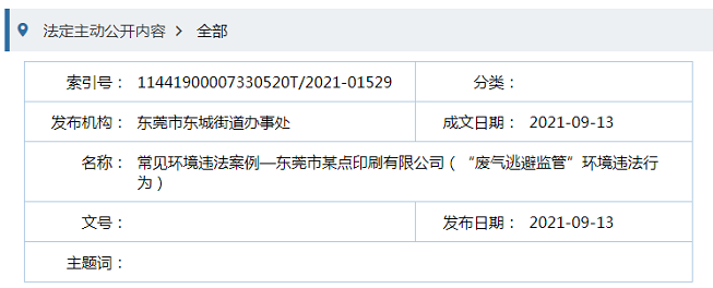 2020年4月28日,東城生態環境分局執法人員現場檢查及調查發現,該單位正在生產,其中1臺輪轉商標印刷機、2臺四色印刷機正在使用,已配套廢氣治理設施,但配套的廢氣治理設施沒有運轉,產生的印刷廢氣未經處理直接排放。