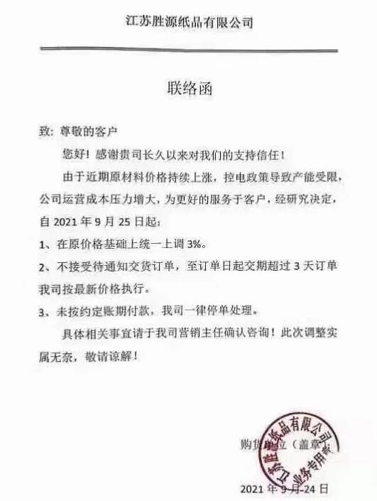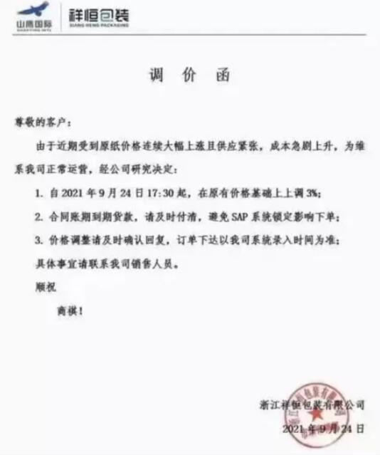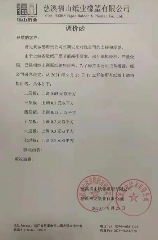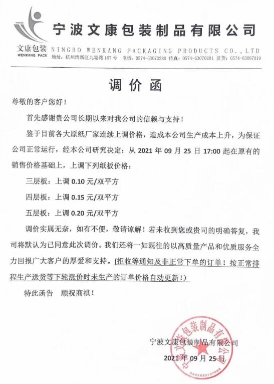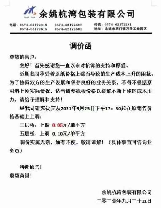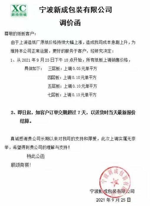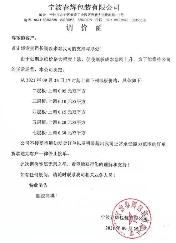 9月25日,寧波市大批紙板廠繼續(xù)跟進(jìn)。慈溪福山、寧波春輝、文康包裝、新成包裝、和熙包裝…短短一個(gè)多小時(shí)內(nèi)數(shù)家紙板廠發(fā)布漲價(jià)函,預(yù)計(jì)更多地區(qū)、更多工廠的漲價(jià)函也將在這兩天陸續(xù)發(fā)布。這場(chǎng)始于限電停機(jī)的漲價(jià)潮洶涌來(lái)臨!