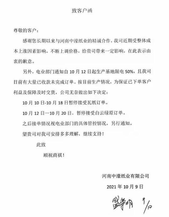 在宣布產品調價的同時,河南中濠紙業還發函表示將暫停接受部分訂單:電業部門通知自10月12日起生產基地限電50%,且我司目前有大量己收款未完成訂單。按目前生產情況,為保證已下單客戶利益及保障及時交貨,公司無奈做出如下決定: 10月10日-10月18日暫停接受瓦紙訂單。 10月12日-10月20日,暫停接受白云綠原訂單。 之后接單情況視電業部門的具體管控情況,另行通知。