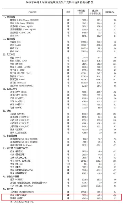 其中,棉花(皮棉,白棉三級(jí))比9月下旬價(jià)格上漲3062.4元/噸,漲幅達(dá)16.6%。同時(shí),在化工產(chǎn)品中,燒堿(液堿,32%)較上期價(jià)格上漲176.4元/噸,達(dá)1370元/噸,漲幅達(dá)14.8%。聚氯乙烯(SG5)和甲醇(優(yōu)等品)本期價(jià)格分別為13008.3元/噸和3614.5元/噸,漲幅分別為13.7%和11.1%。