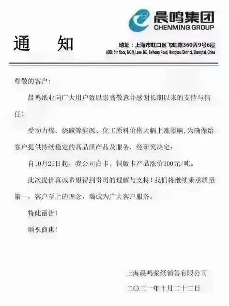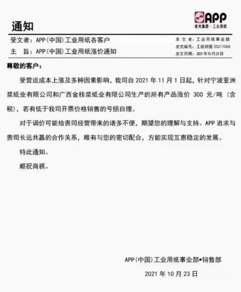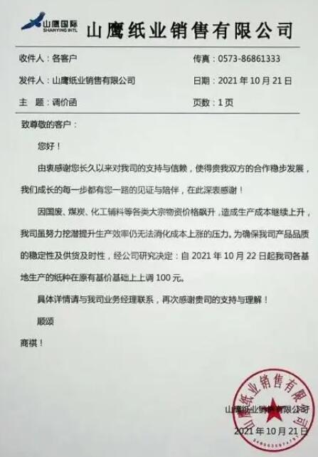 開五停二、開三停四……又一化工大省開啟“限電輪停”模式!江蘇、浙江、廣東等上調工業電價:最高漲80%! 柴油價格直逼7元大關后,百公里油費增加90元!更為不妙的是,柴油危機有進一步加深的趨勢,加油站從限量100升,變成了限量100元,物流成本飆升已在眼前。 ...... 沒有意外,工業原紙和紙板又開始漲價了。10月21日,山鷹發布漲價函,各基地全系列漲價100元/噸。