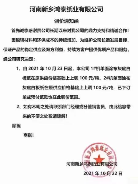 隨著原材料成本、用電成本、能源成本急速上漲,二級紙板廠也頂不住了!從10月20日開始陸續傳出漲價函。持續不斷的漲價,如果從9月開始算,已經整整6輪。