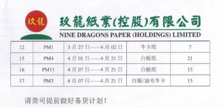 11月8日,玖龍紙業(控股)有限公司發布“關于2022年春節前后停機檢修的公函”,東莞基地將在2022年春節前后停機檢修,時間跨度從2022年1月22日到4月21日。單臺紙機的停機時長7-21天不等,整廠停機總時廠合計234天,產品涵蓋?垺⑼呃慵垺装寮、文化紙、白面/涂布牛卡紙。
