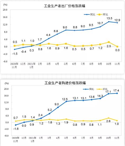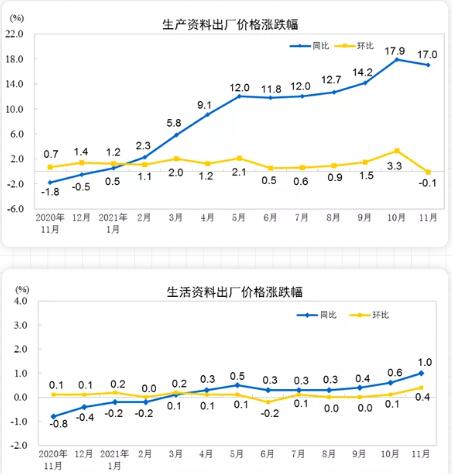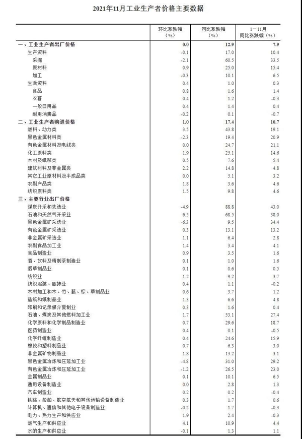 12月9日,國家統計局發布最新數據統計。2021年11月份,全國工業生產者出廠價格同比上漲12.9%,環比持平;工業生產者購進價格同比上漲17.4%,環比上漲1.0%。1—11月平均,工業生產者出廠價格比去年同期上漲7.9%,工業生產者購進價格上漲10.7%。其中,印刷和記錄媒介復制業在今年11月同比上漲1.6%,環比上漲0.3%。