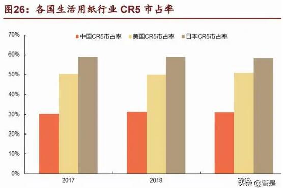 但長期來看,品牌化、高品質(zhì)化依然是行業(yè)發(fā)展趨勢。與美國的造紙行業(yè)發(fā)展歷史 對(duì)比,中國已經(jīng)走過美國相似的道路,目前處于美國造紙行業(yè)發(fā)展的第二、三階段之間,正值行業(yè)集中度上升期,我國生活用紙行業(yè)集中度雖超過 30%,但較美國生 活用紙行業(yè) CR5 市占率 60%仍有較大上升空間。 在政策方面,近年來,各級(jí)政府部門加大了對(duì)生活用紙行業(yè)的監(jiān)督管理執(zhí)法力度,對(duì)一些經(jīng)濟(jì)規(guī)模不合理、能耗水耗較高、排放不達(dá)標(biāo)的企業(yè)采取了關(guān)停或限期整改的措施,淘汰了大量落后產(chǎn)能。隨著造紙行業(yè)環(huán)保政策趨嚴(yán),環(huán)保設(shè)施不健全或產(chǎn)能落后的造紙企業(yè)將被陸續(xù)淘汰,同時(shí),行業(yè)的準(zhǔn)入門檻也在提高,行業(yè)集中度有望提升。