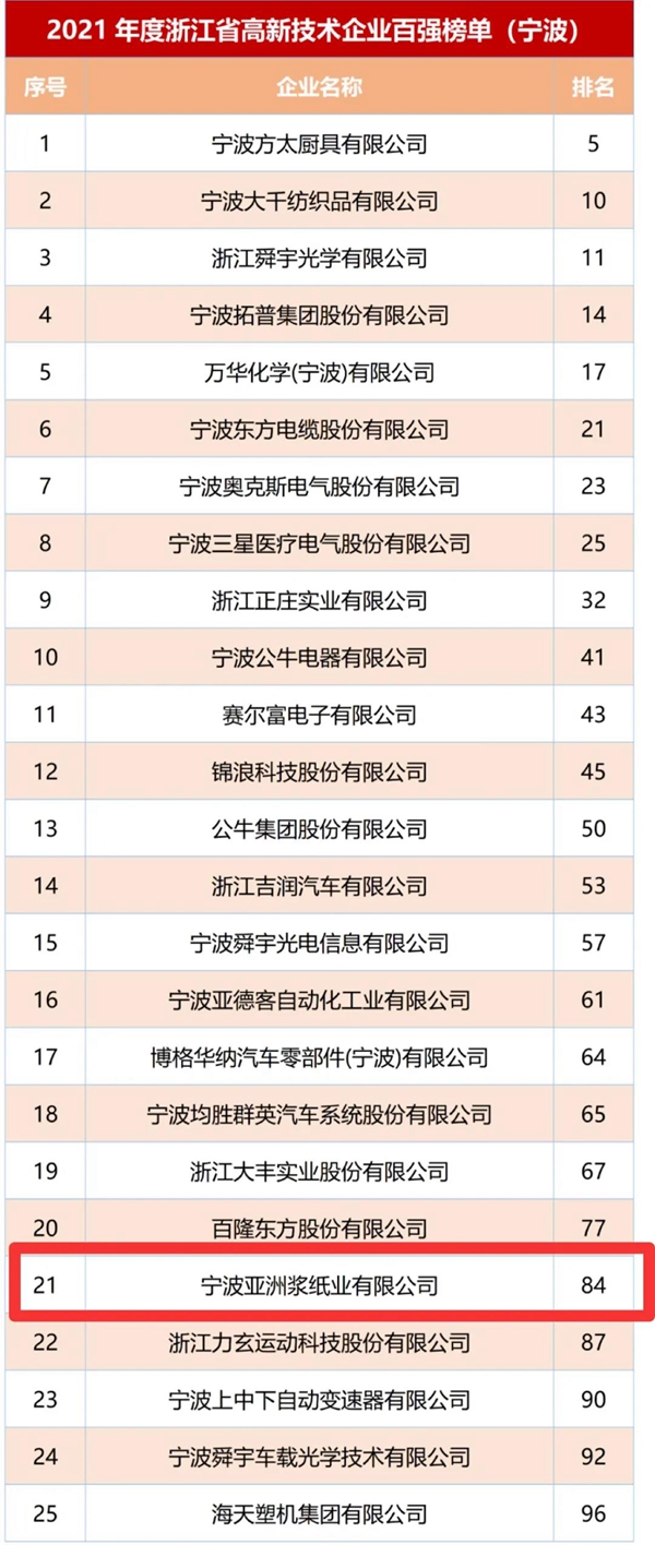 元旦前夕,從寧波市科技局傳來消息,2021年度浙江省高新技術企業創新能力百強和各領域十強榜單日前發布,寧波亞洲漿紙業榮登“2021年度浙江省高新技術企業創新能力百強榜”第84位,連續第二年入圍百強榜。寧波25家企業入圍,北侖區擁有8家,位列全省第二。寧波亞漿多年來堅持科技引領、創新發展,尤其在數字化轉型、智能制造方面,以市場為導向,以新品研發品牌建設為抓手,以四輪驅動科技創新為動力,不斷推進公司高質量發展。
