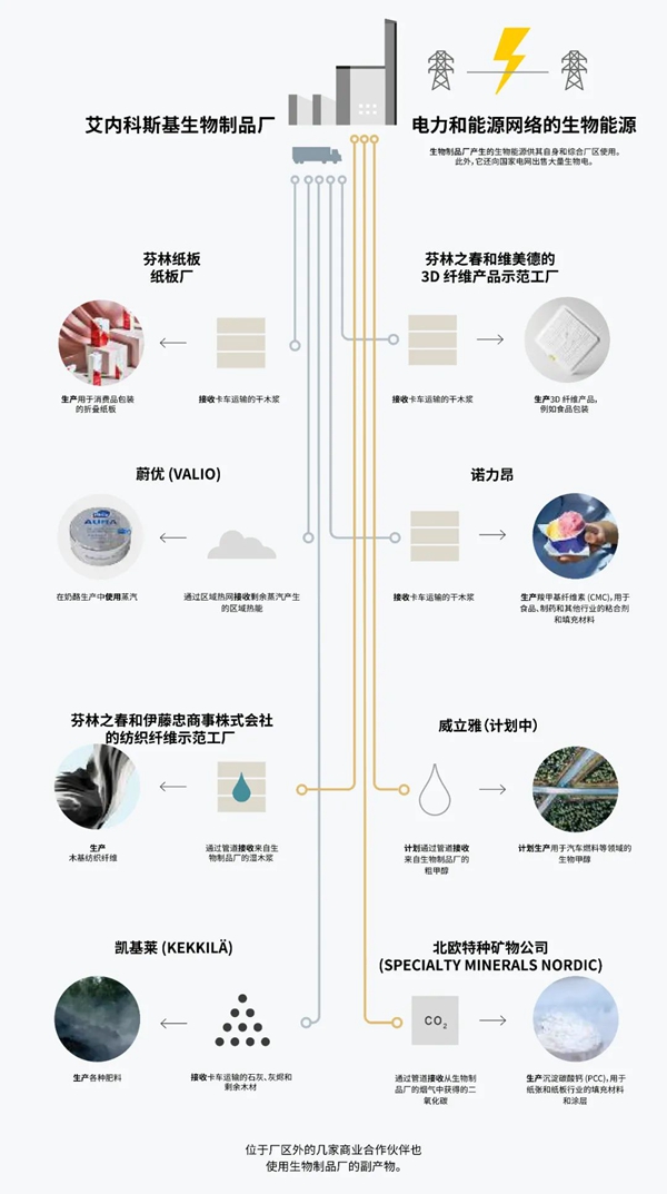 生態系統的核心合作伙伴網絡圍繞艾內科斯基生物制品廠運營,使用芬林芬寶生產的木漿或來自其木漿生產的副產物。這帶來了廣闊的價值鏈,并為中小型企業生產高附加值創新生物制品提供了重要機會。 艾內科斯基生物制品廠于2017年開始運營。其生態系統經過蓬勃發展,產生了全新的業務領域。生物制品廠周邊有芬林集團的紙板廠、樺木膠合板廠和紡織纖維示范廠,以及各合作伙伴的生產設施。有由松木和樺木制成的木漿、生物化學品和生物能源等傳統產品,現在還有新的生物制品。 芬林芬寶業務發展高級副總裁Kaija Pehu-Lehtonen說: “生物制品廠的商業模型以高效的合作伙伴網絡為基礎,在該網絡中,新產品在各參與者的合作下得到升級。單一的參與者無法掌握所有可能的專業領域,因此有必要建立一個強有力的合作伙伴網絡尋找新的熱門產品。” “專門從事生物材料、生物化學品、生物能源等領域的企業受邀加入艾內科斯基的生態系統。其規模不一,發展階段也不同。”她指出。“生態系統合作伙伴之間的合作刺激了新生物制品的發展。這種模型將廣泛的核心競爭力結合一起,創造了巨大的協同效應。”