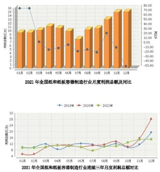 2021年,我國紙和紙板容器行業規模以上企業累計完成利潤總額132.29億元,同比下降5.33%,增速比去年同期下降了0.38個百分點。