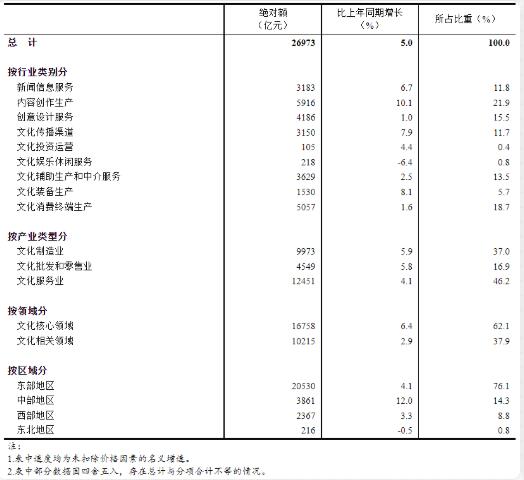 01、分業態看,文化新業態特征較為明顯的16個行業小類實現營業收入9407億元,比上年同期增長6.3%,高于全部規模以上文化及相關產業企業1.3個百分點。 02、分行業類別看,新聞信息服務營業收入3183億元,比上年同期增長6.7%; 內容創作生產5916億元,增長10.1%; 創意設計服務4186億元,增長1.0%; 文化傳播渠道3150億元,增長7.9%; 文化投資運營105億元,增長4.4%; 文化娛樂休閑服務218億元,下降6.4%; 文化輔助生產和中介服務3629億元,增長2.5%; 文化裝備生產1530億元,增長8.1%; 文化消費終端生產5057億元,增長1.6%。 03、分產業類型看,文化制造業營業收入9973億元,比上年同期增長5.9%;文化批發和零售業4549億元,增長5.8%;文化服務業1.25萬億元,增長4.1%。 04、分領域看,文化核心領域營業收入1.68萬億元,比上年同期增長6.4%;文化相關領域1.02萬億元,增長2.9%。 05、分區域看,東部地區實現營業收入2.05萬億元,比上年同期增長4.1 %;中部地區3861億元,增長12.0%;西部地區2367億元,增長3.3%;東北地區216億元,下降0.5%。 權威解讀: 今年第一季度,我國文化及相關產業延續恢復性增長態勢,全國規模以上文化及相關產業企業比上年同期增長5.0%。 值得注意的是,文化核心領域穩定增長,比上年同期增長6.4%,增速高于文化相關領域3.5個百分點;占文化企業營業收入比重為62.1%,占比高于上年同期0.8個百分點。具體來看,文化核心領域6個行業中,3個行業增速高于文化企業平均水平,其中內容創作生產增速達10.1%,文化傳播渠道、新聞信息服務增速分別為7.9%、6.7%。以接觸性、聚集性服務為主的文化娛樂休閑服務,受疫情影響較大,營業收入比上年同期下降6.4%。 此外,文化新業態營業收入占比提高。以數字出版、智能文化設備制造等為代表,文化新業態特征較為明顯的16個行業小類實現營業收入9407億元,比上年同期增長6.3%,增速高于文化企業平均水平1.3個百分點;占文化企業營業收入比重為34.9%,占比高于上年同期0.4個百分點。 下階段,在做好疫情防控工作的基礎上,隨著文化市場發展環境進一步優化,助企紓困政策精準落地,文化及相關產業有望保持平穩健康發展。