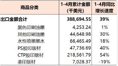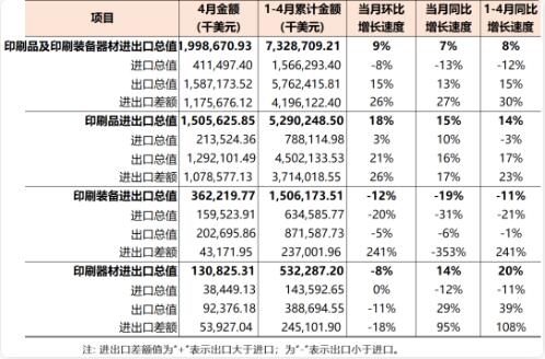 2022年1-4月,國內印刷器材進出口貿易順差2.45億美元(同比增長108%)。 本期觀察 受國內外多重因素影響,國內印刷產業相關商品進出口貿易保持平穩運行的壓力顯著增加。2022年1-4月國內印刷品、印刷裝備、印刷器材三大類商品進出口雖然保持了8%的同比增長速度,但其相關商品的進口和出口則呈現出與去年不同的運行特點: 三大類商品進口速度均相對萎縮:1-4月份,國內印刷產業相關商品進口同比下降12%。其中,印刷品進口同比下降3%、印刷裝備同比下降21%、印刷器材同比下降11%。 印刷品、印刷器材出口大幅增長、印刷裝備出口下降:在三大類商品進口均從處下降的同時,國內印刷品出口增長17%、印刷器材出口增長39%,而印刷裝備出口下降1%。 亞洲市場穩定、歐洲和北美的市場更加鞏固:1-4月份,國內印刷品、印刷裝備、印刷器材進出口在亞洲、歐洲和北美洲三大區域市場的分布為,亞洲43%、歐洲23%、北美洲24%。與去年同期相比(相關進出口規模),亞洲市場增長2%、歐洲市場增長10%、北美洲市場增長17%。 與2021年同期相比,2022年1-4月國內印刷品、印刷裝備、印刷器材進口和出口增長較快的前五個商品商品類別如下: 進口:期刊及雜志類印刷品(+306%)、柔版印刷機(+242%)、PS膠印版材(+58%)、辦公類印刷品(+5%)、水性噴墨墨水(+2%); 出口:膠印機(+79%)、柔版印刷機(+56%)、CTP膠印版材(+54%)、PS膠印版材(+40%)、紙袋(+32%)。 同期,國內印刷品、印刷裝備、印刷器材進口和出口相對萎縮的前五個商品商品類別如下: 進口:凸印機(-98%)、CTP膠印版材(-81%)、兒童圖畫書類印刷品(-78%)、其他出版物印刷品(-72%)、包裝印后設備(-51%); 出口:其他出版物印刷品(-58%)、票證類印刷品(-57%)、期刊及雜志類印刷品(-49%)、書刊裝訂設備(-20%)、柔印版材(-19%)。
