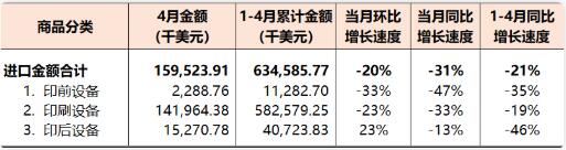 印刷裝備 2022年4月,國內印刷裝備進口1.60億美元(參見表4),環比下降20%、同比下降31%。其中,印前設備進口228.88萬美元(環比下降33%、同比下降47%)、印刷設備進口1.42億美元(環比下降23%、同比下降33%)、印后設備進口1527.08萬美元(環比增長23%、同比下降13%)。 表4 2022年4月國內印刷裝備進口統計