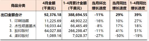 2022年1-4月,國內印刷器材出口3.89億美元(參見表7),同比增長39%。其中,黑色印刷油墨861.24噸、425.32萬美元(同比增長1%)、其他印刷油墨7797.14噸、4464.90萬美元(同比增長30%)、水性噴墨墨水8726.74噸、6646.55萬美元(同比增長18%)、PS膠印版材1488.15萬平方米、4773.67萬美元(同比增長40%)、CTP膠印版材6053.65萬平方米、2.19億美元(同比增長54%)、柔印版材16.62萬平方米、702.84萬美元(同比下降19%)。 表13 2022年1-4月國內印刷器材出口統計